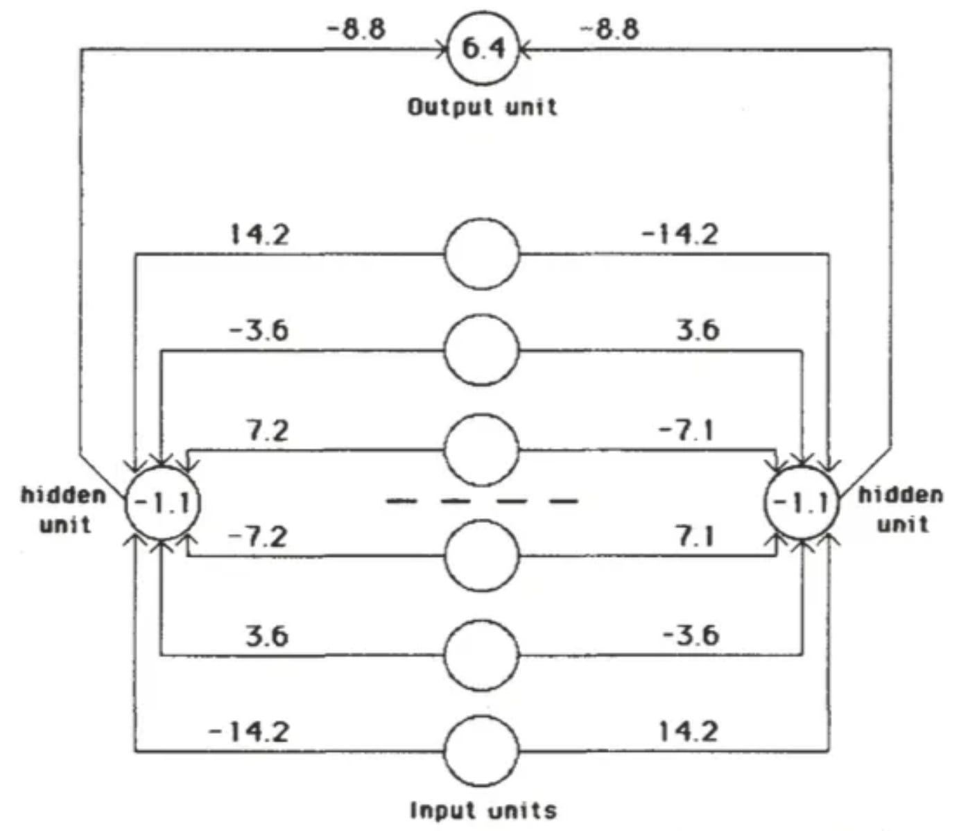 The key property of this solution is that for a given hidden unit, weights that are symmetric about the middle of the input vector are equal in magnitude and opposite in sign. So if a symmetrical pattern is presented, both hidden units will receive a net input of 0 from the input units, and, because the hidden units have a negative bias, both will be off. In this case the output unit, having a positive bias, will be on.