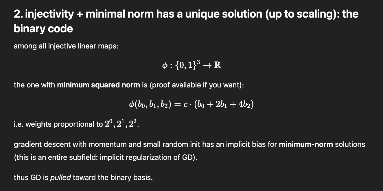 The particular learned weights (14.2, -3.6, 7.2) seem to be an artifact of the random initialization. You’d get different weights w0, w1, w2 if you re-ran this, but they’d still be in some permutation of 1:2:4 because this is the minimum-norm solution for an injective map from bits to scalar.