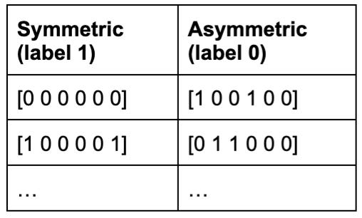 64 six-bit vectors. Of these, eight are symmetric1 and given ground-truth output label ‘1’. The other 56 are given ground-truth output label ‘0’.