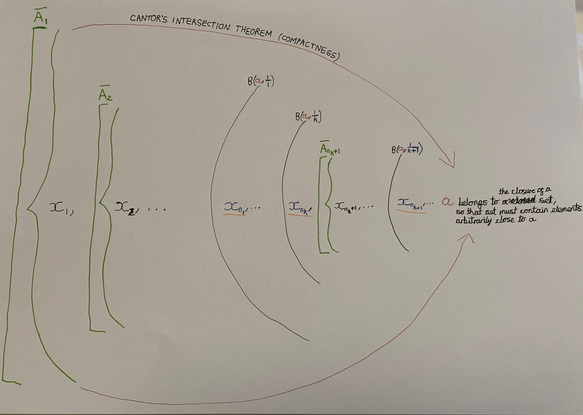 We’re using closed sets to guarantee the existence of elements. The nested sets guarantee the existence of a. Those same sets guarantee the existence of elements arbitrarily close to a; we construct another closed set to prove the existence of each next point in our sequence converging to a.