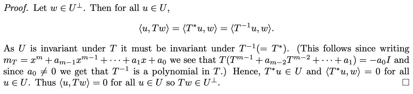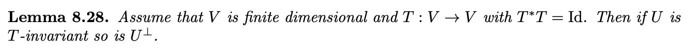 It’s the same proof, but in each case, we show T-invariance of orthogonal complement / “The street keeps to itself, which polarizes” differently.