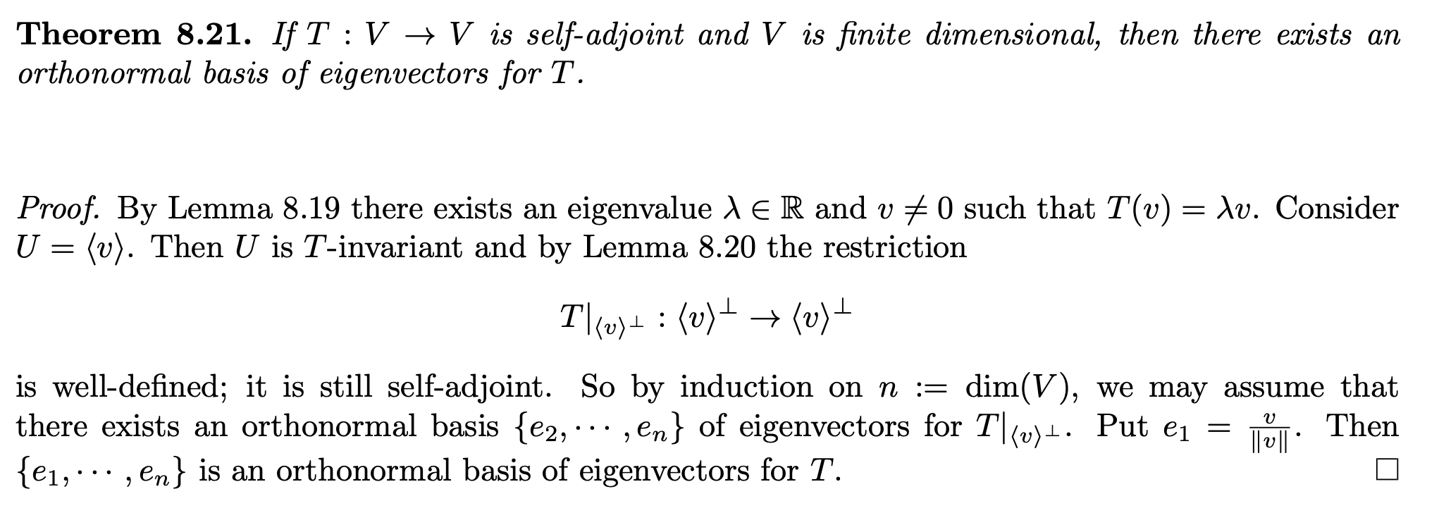 we can work over C => because C is algebraically closed, characteristic polynomial has a root => ah, these roots / eigenvalues are real (because T self-adjoint)