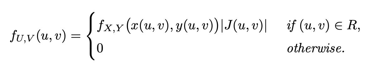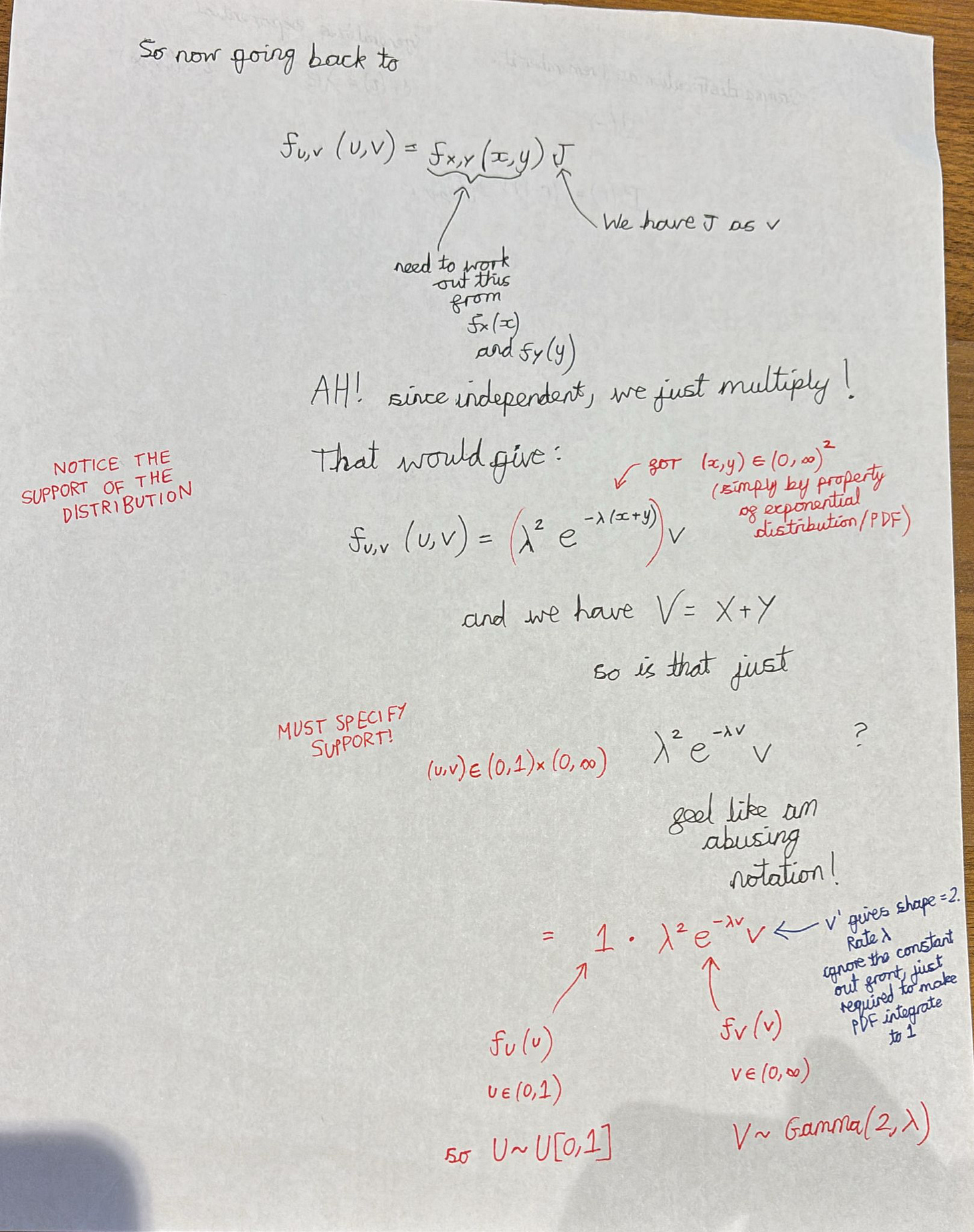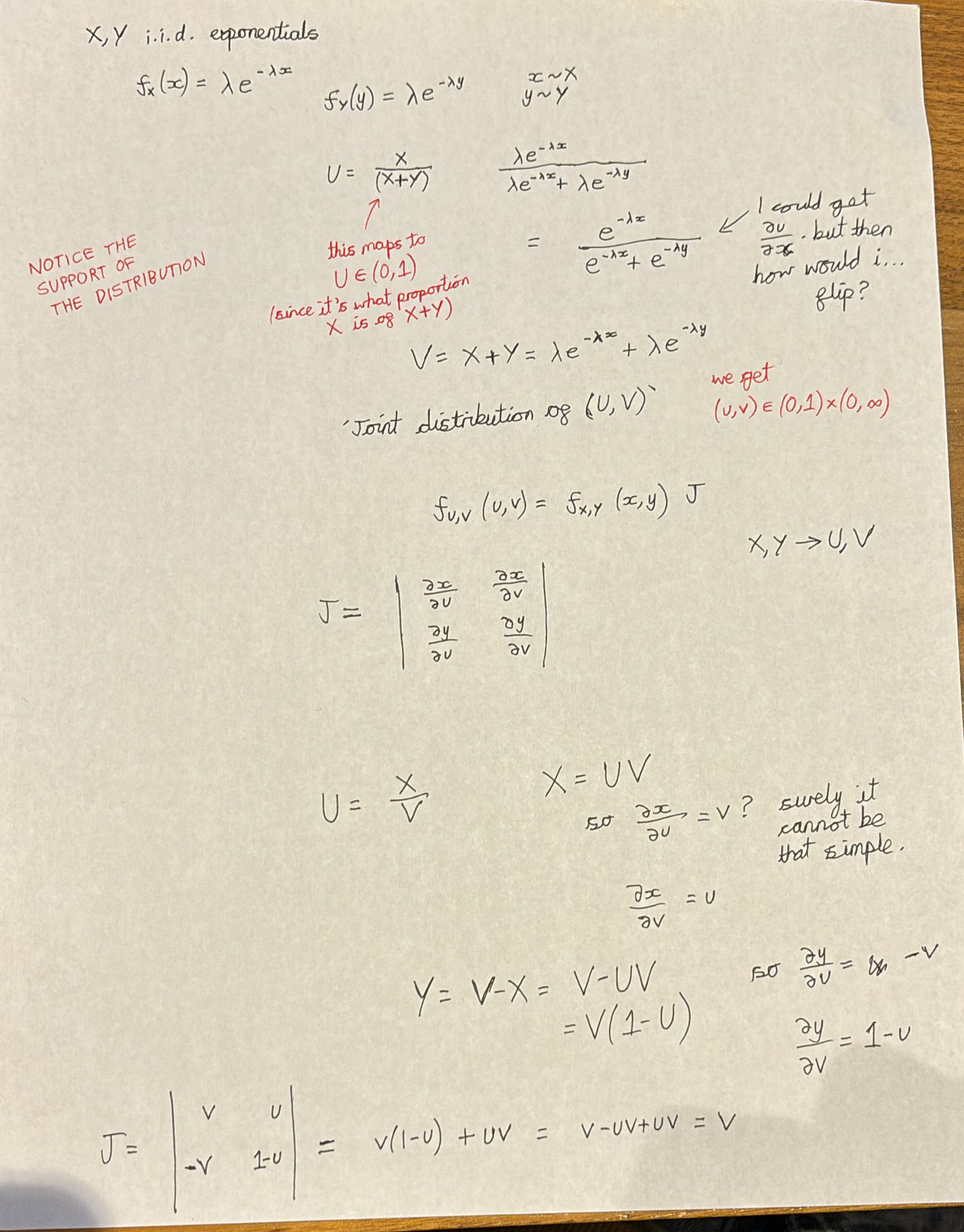Naturally, I then tried finding the new joint PDF following a ‘change of variables’ transformation. My biggest oversight was failing to consider a) the support of the original RVs, and b) the support of the new RVs. For example, when we have U = X / (X + Y), now U will only have support (0,1).