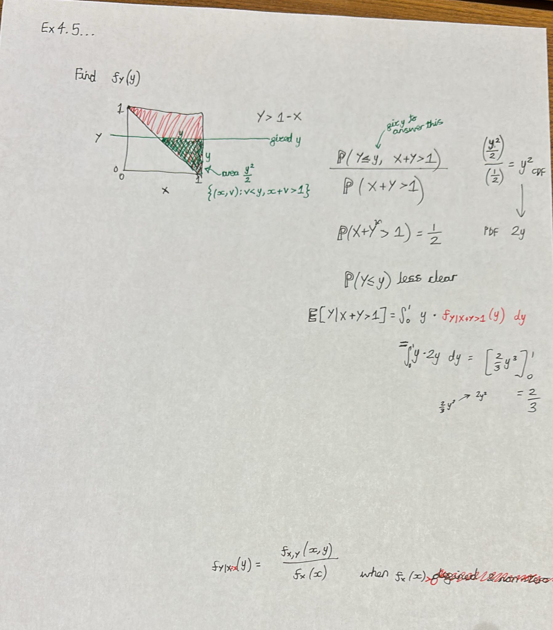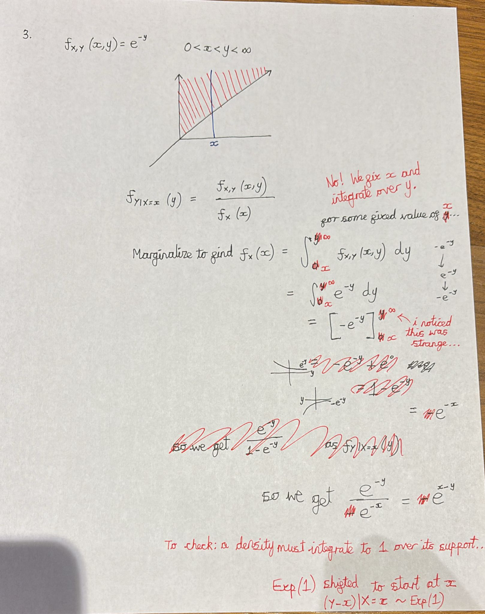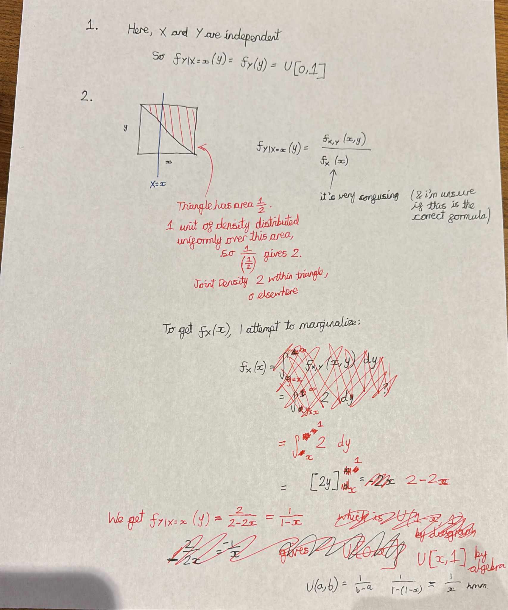 Conditional distributions can get pretty confusing. I asked Claude to throw me a few problems (good practice!). It turns out I wasn’t great at identifying limits of integration, initially.