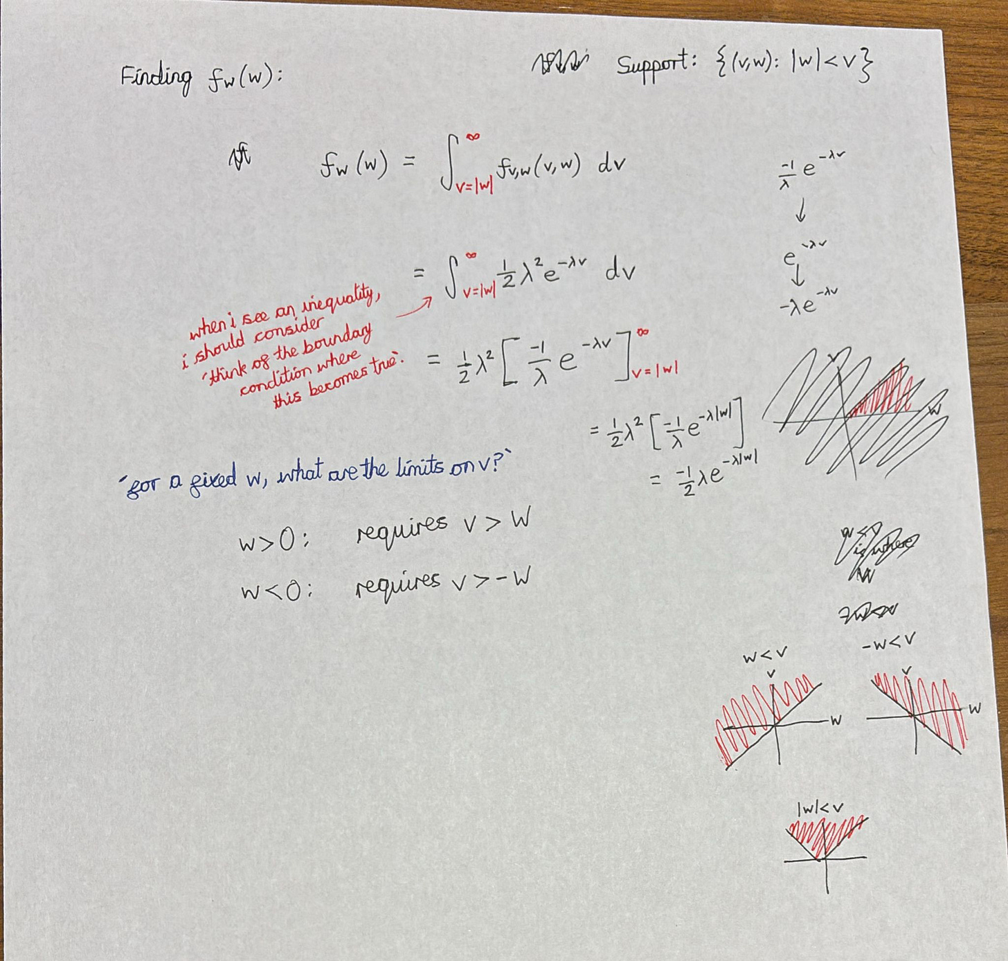 There’s also this matter of recognizing the distribution at the end. I think I really need to drill recognizing distributions and their CDFs, PDFs, MGFs (and what else?). In this case, we see the PDF of Gamma(2, λ) at the end!