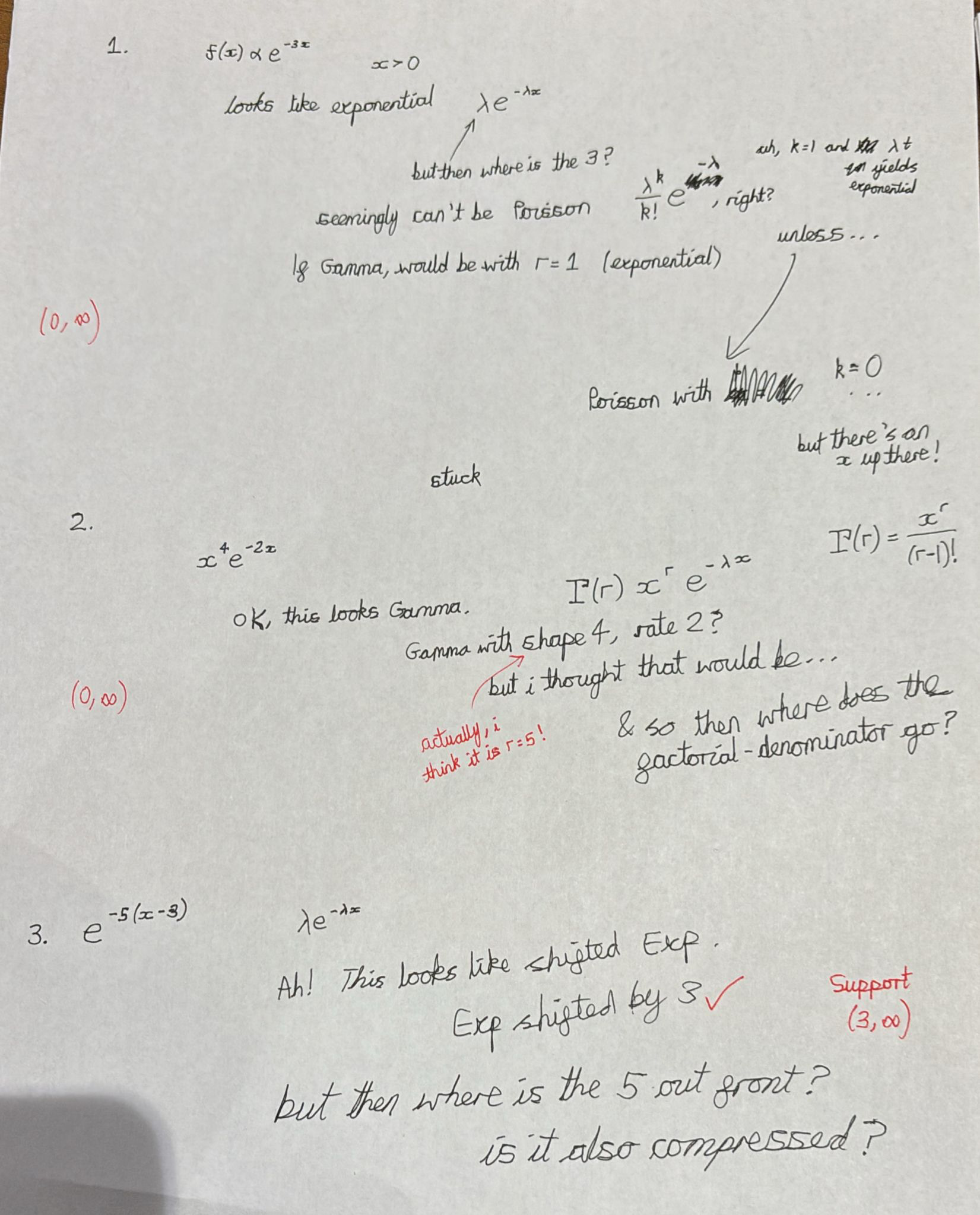 I also failed to recognize a shifted exponential. Noted: I also need to drill recognizing shifted distributions, as well as special cases (like where some parameter is set to 1, rendering the final form fairly simple).