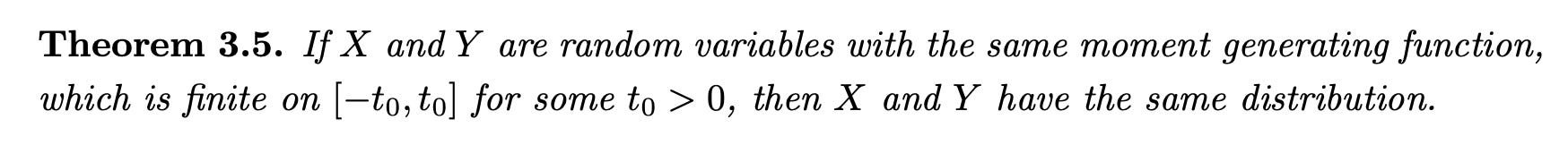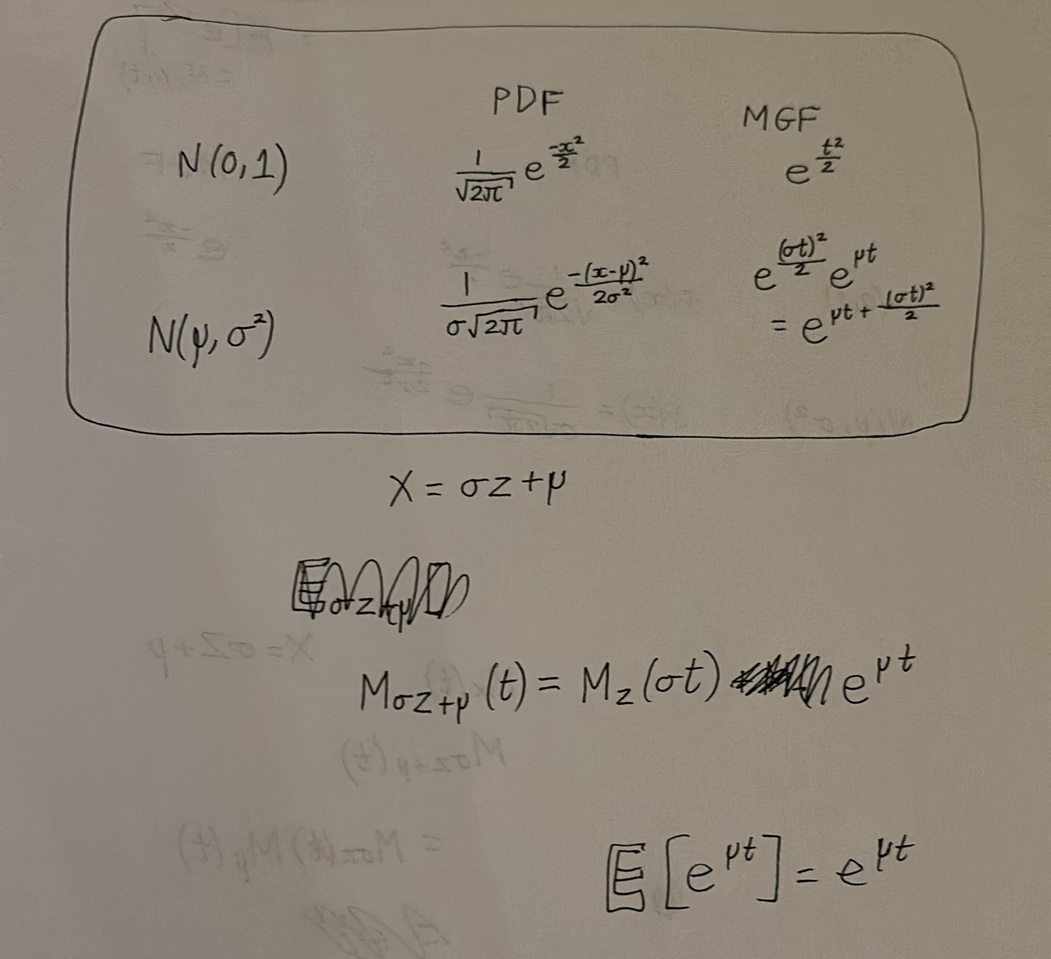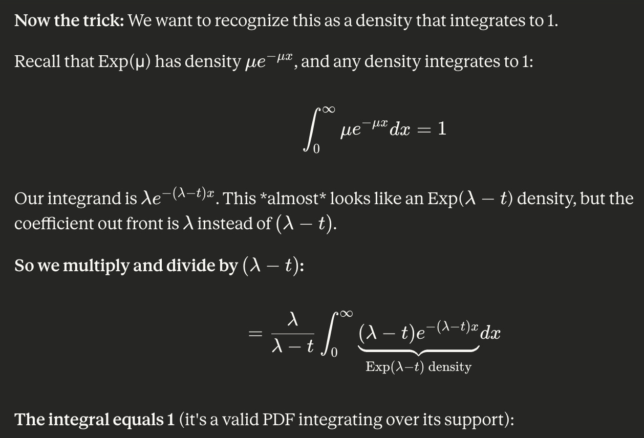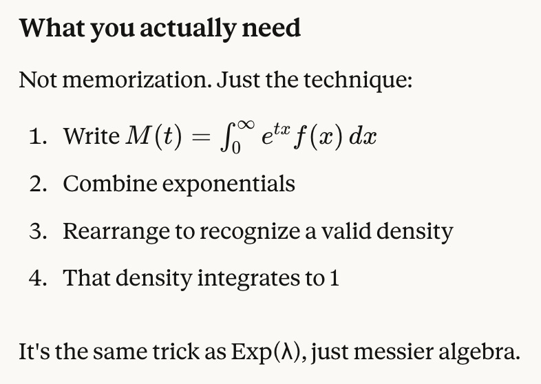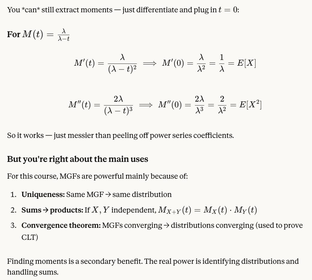 Wow! I learned how to derive MGF for Normal(μ, σ²), Gamma(r, λ), Exp(λ) (which also involved reviewing PDFs of these), + reviewed uniqueness and independence (sum variables → multiply MGFs). We don’t look at PGFs so much because that’s Prelims material.