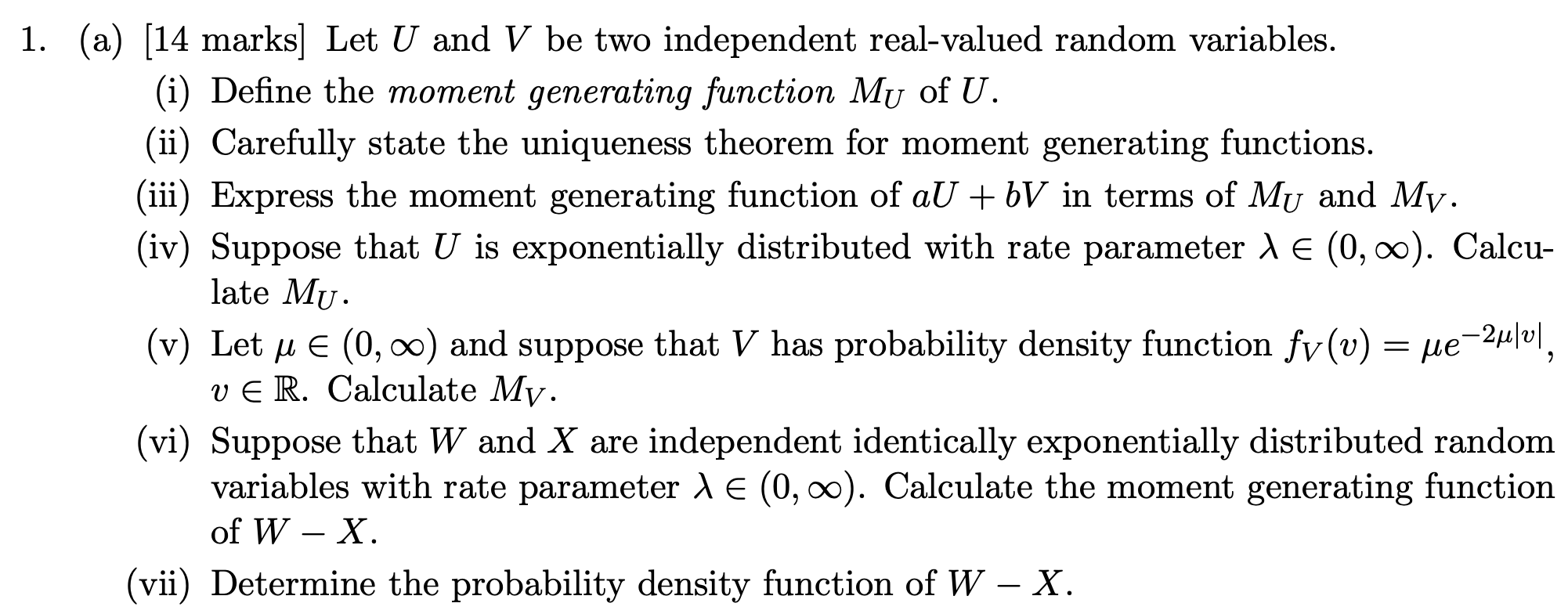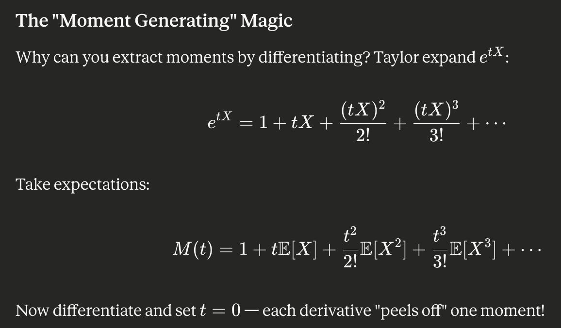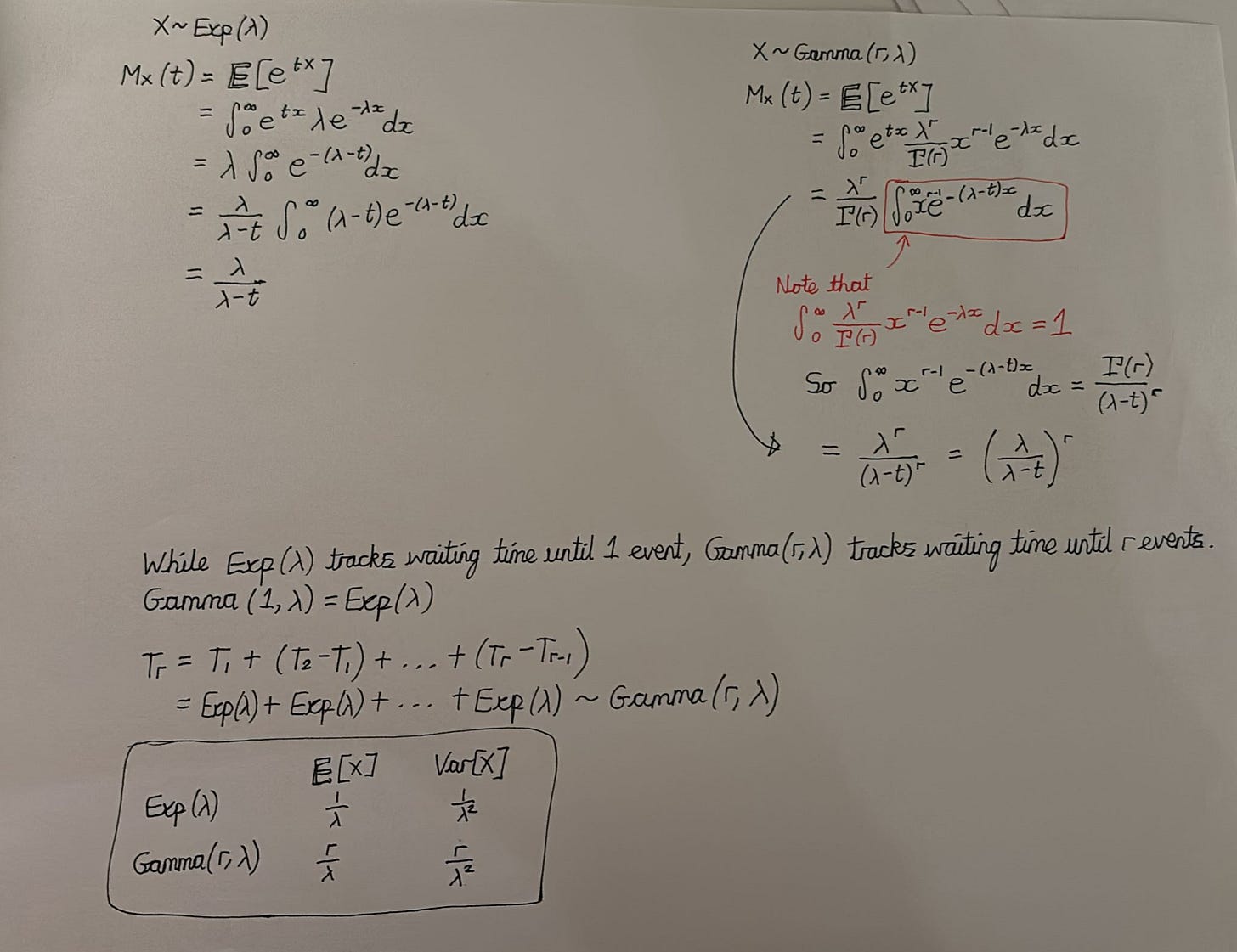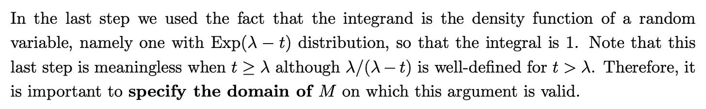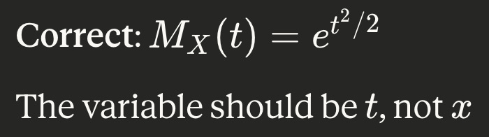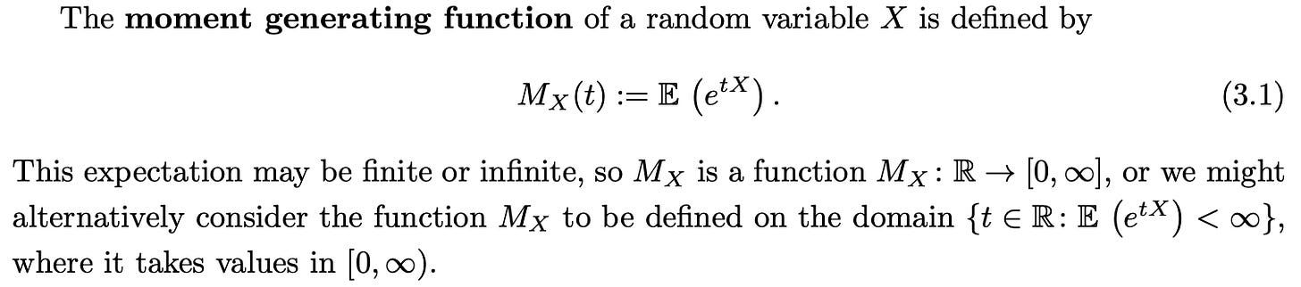 Wow! I learned how to derive MGF for Normal(μ, σ²), Gamma(r, λ), Exp(λ) (which also involved reviewing PDFs of these), + reviewed uniqueness and independence (sum variables → multiply MGFs). We don’t look at PGFs so much because that’s Prelims material.