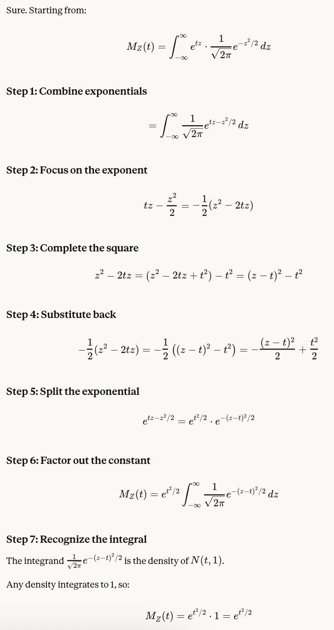 I would need to re-derive a lot of this stuff on the spot, though. I’m letting myself memorize the Normal density function :/, although this is an excellent derivation. I should probably remember some ‘endpoints’ so I have a sense of where I’m headed when deriving…